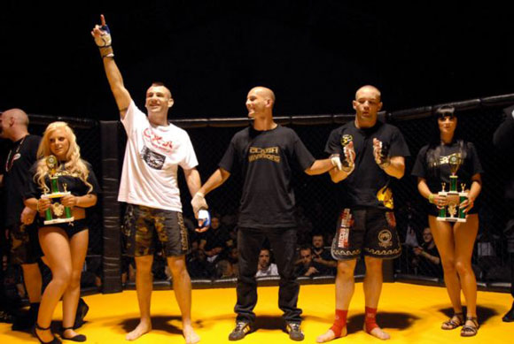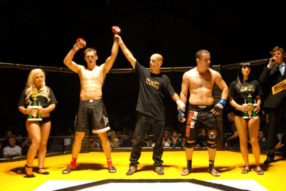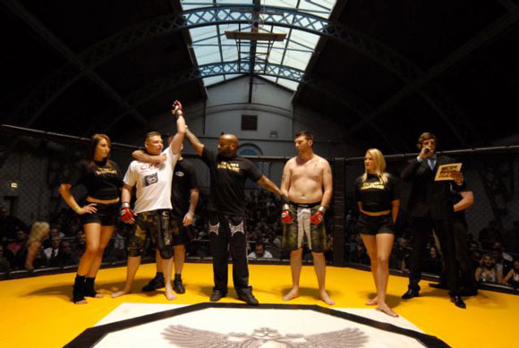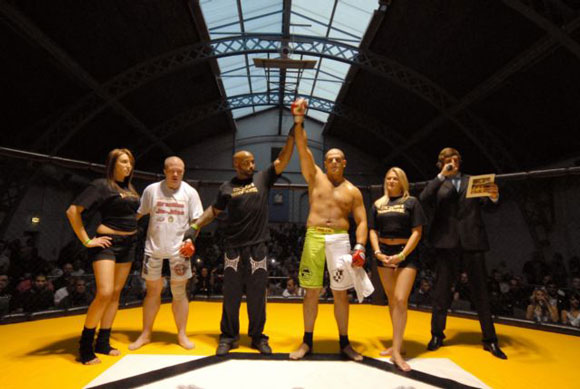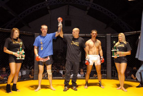 Dave had brought plenty of fans with him, which helped spur  him on to one of the shortest fights we’ve ever seen. Within the first couple  of seconds both fighters got a couple of punches in, but after only 10 seconds  of the first round, Dave delivered a spectacular knockout punch that left Simon  motionless on the floor and had the paramedics racing into the cage. Luckily,  he was given the all-clear after the doctors checked him out. (The referee for  this fight was Dean Amasinger).